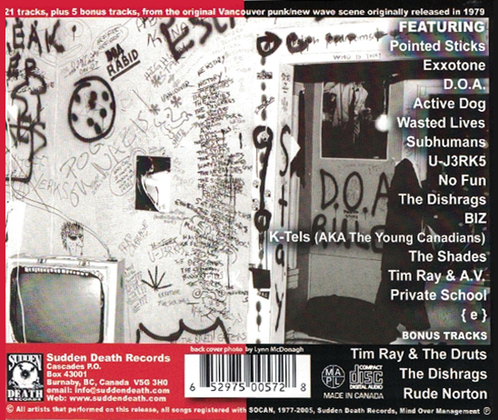 26 SONGS by 17 BANDS! FEATURING Pointed Sticks, Exxotone, D.O.A., Active Dog, Wasted Lives, Subhumans, U-J3RK5, No Fun, Dishrags, BIZ, K-Tels (AKA The Young Canadians), Shades, TimRay and A.V., Private School and {e?}. BONUS TRACKS FROM I, Braineater, and Rude Norton!