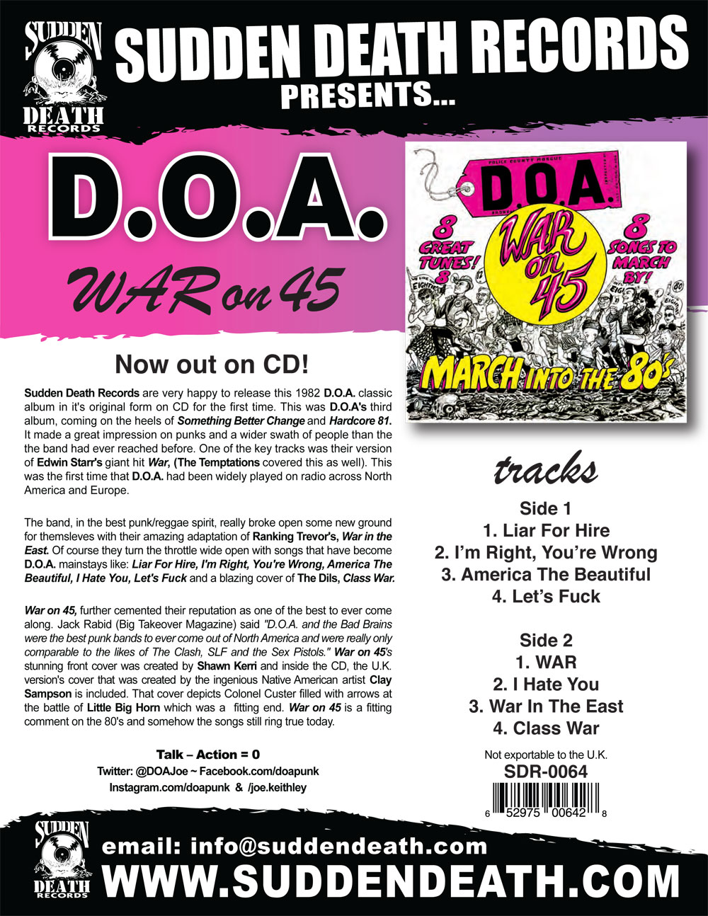 Sudden Death RecordsDOA - War on 45 CDSudden Death 30th Anniversary reissue of D.O.A.'s classic WAR on 45..