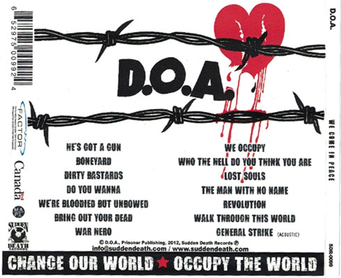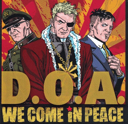 2012 release, the 14th studio album from the Canadian Punk legends. We Come in Peace takes a determined political stance with the songs 'We Occupy,' 'Dirty Bastards,' 'We're Bloodied But Unbowed' and a cover of Toxic Reasons' classic 'War Hero.' We Come in Peace also features a heavy slice of Ska, Reggae and Dub with tracks like 'Walk Through This World.' You'll also get your head ripped clean off on the crushing anthems 'Boneyard,' 'Bring Out Your Dead' and 'Who the Hell Do You Think You Are.' Canada's godfather of hardcore punk Joe Keithley also got some cool friends to sing on the record: Jello Biafra, Ben Kowalewicz (Billy Talent) and Hugh Dillon (Headstones). And DOA also recorded a great version of the Beatles' 'Revolution.' It's now a real barnburner!