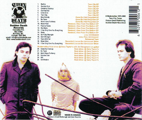 Coming ashore with the second wave of Vancouver new wave punk, (1980-83) the Modernettes delivered some great songs. Led by Buck Cherry (John Armstrong) and backed by Mary Jo Kopechne and Jughead on bass and drums, the Modernettes had a distinct personality and style that wasn't just copying the latest band of yobs from the U.K. Listen to the rawness and the pure ecstatic melody of; "Teen City", "Suicide Club" and "Rebel Kind" and of course what should have been a smash hit "Barbra". Then check out the melancholy of "Confidential". Also included are tracks from the rare Gone but not Forgiven LP, the View From the Bottom EP, as well as super-rare unreleased live tracks & rehearsal recordings, as well as their last show, featuring Art Bergmann on guitar.